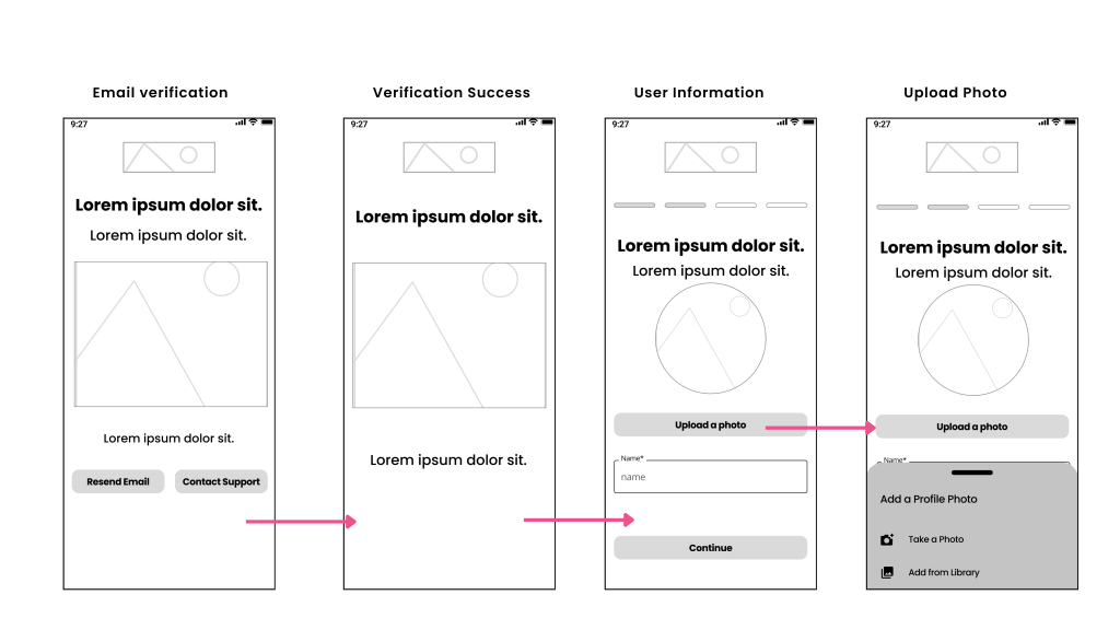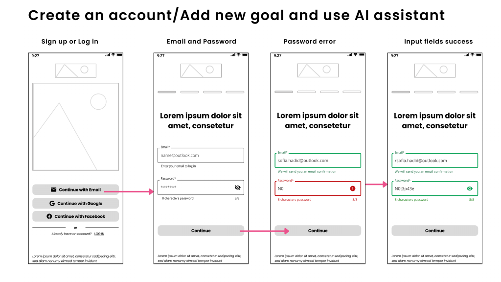 Building on my initial sketches, I created mid-fidelity wireframes that define Goalin’s main interactions—designing the layout, UI components, and navigation users depend on to achieve their goals. I used common design patterns like progress indicators, input feedback, and modal windows to minimize friction and guide users smoothly through the interface with familiar, intuitive elements.
