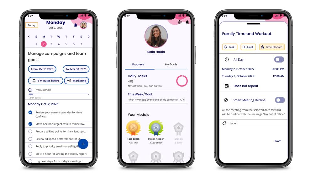 The project also enhanced my understanding of how deliberate UX design makes applications truly practical. Integrating AI to support task breakdown showed how technology can reduce cognitive load rather than add complexity. . Creating flows like progress tracking and calendar time blocking pushed me to think systematically, showing how well-organized components and interactions enable users to transition smoothly from intention to action.