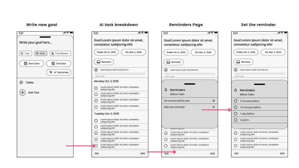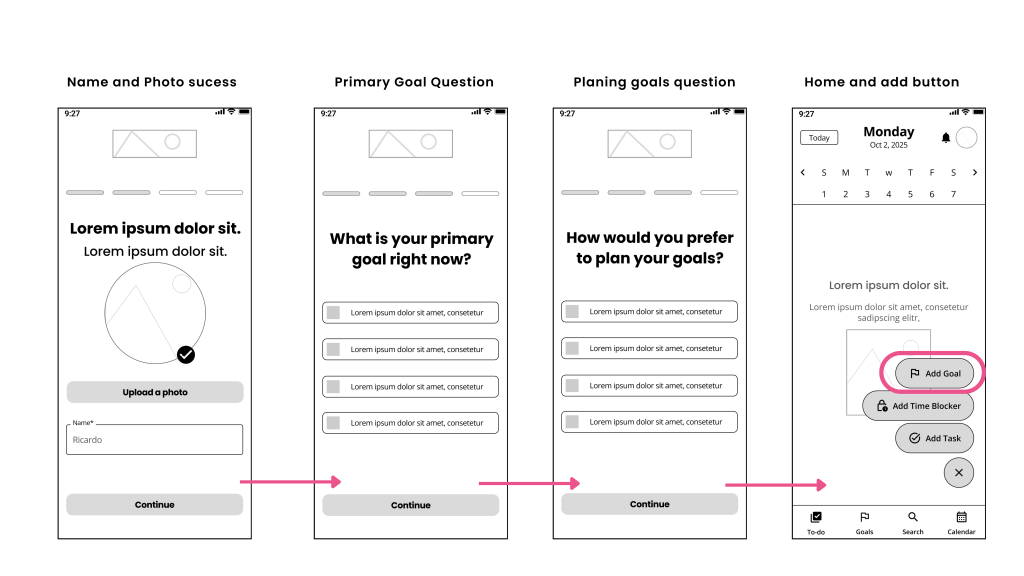 Starting with a mobile-first mindset, I translated and mapped user flows into low-fidelity wireframes to outline how users interact with Goalin’s main features. This was driven by the fact that most of my users preferred a mobile solution they could access whenever they wanted, and to ensure task completion through mobile reminders. My aim was to visualise navigation patterns and structure key interactions—such as task creation, goal tracking, and time blocking—before proceeding to detailed design.