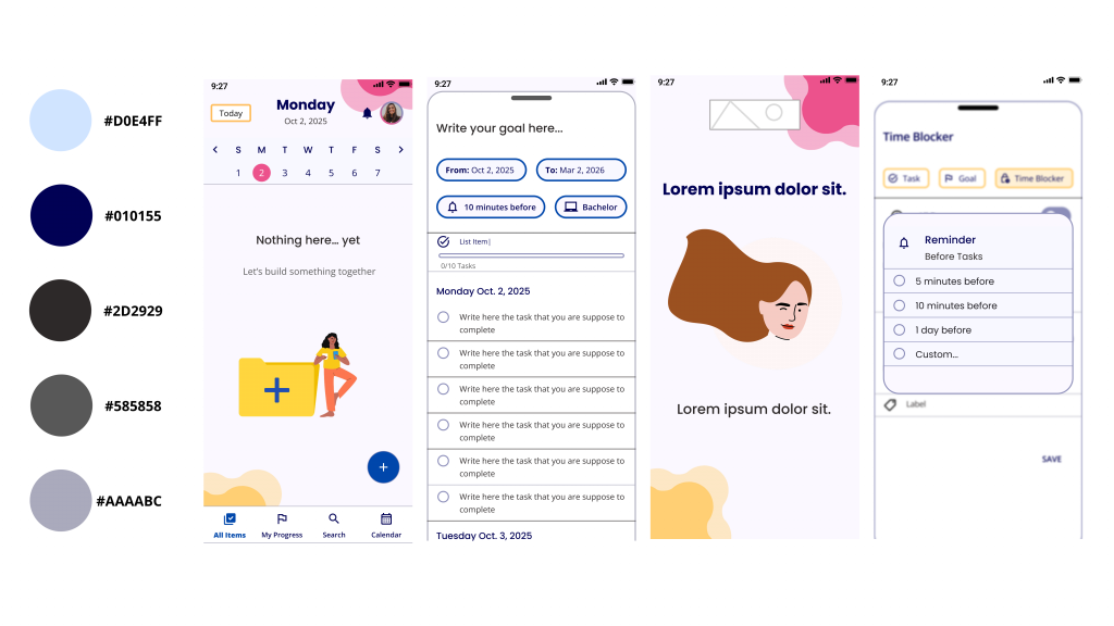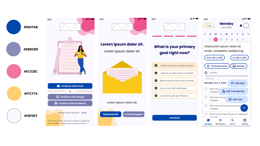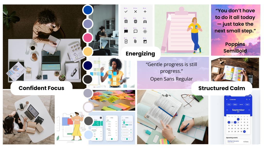 I began with a mood board that captured the emotional tone and aesthetic style of the product. Drawing inspiration from users seeking calm structure and daily motivation, I selected a palette of deep blues and gentle violet-grey, complemented by energetic accents like bold pink and cheerful yellow. This contrast embodies Goalin’s mission—offering a focused, reassuring space with sparks of energy and momentum.