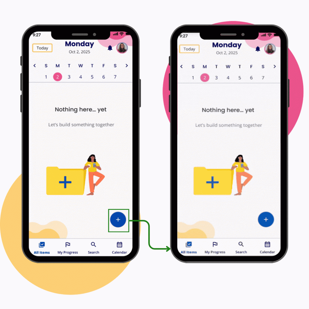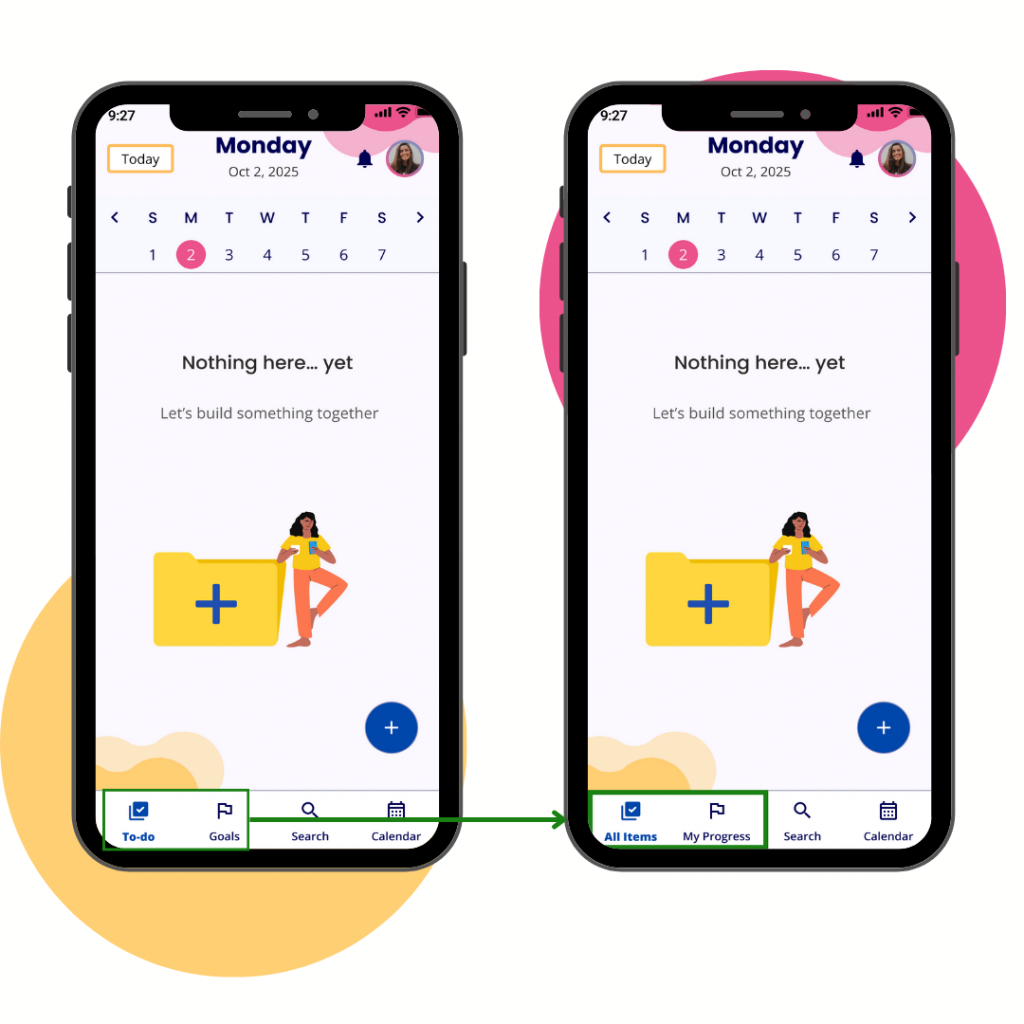 Change 1: : Rename the navigation items“To-Do” and “Goals”  to “All Items” and  “Progress”.