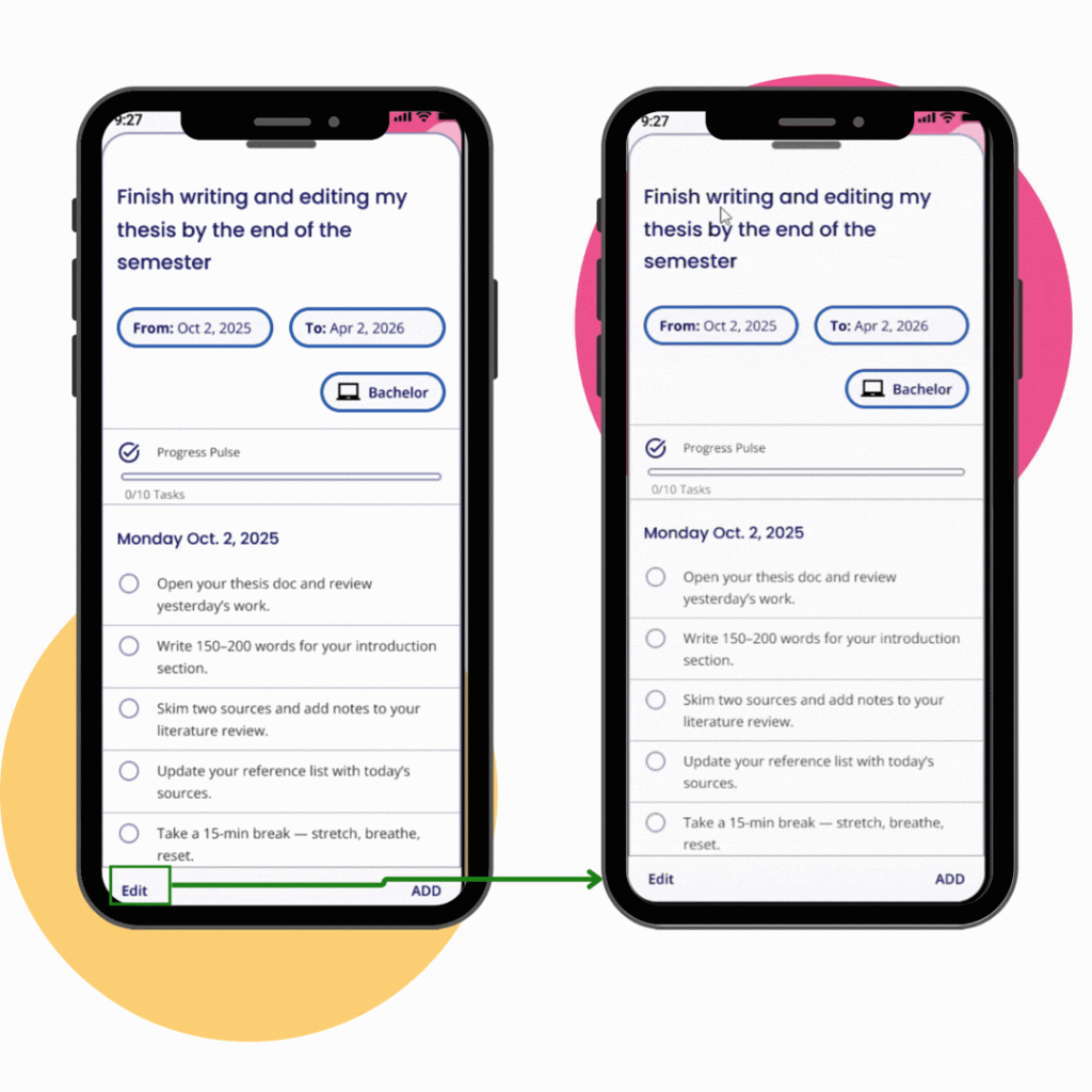 During usability testing, participants clearly indicated a need to edit tasks after AI suggestions when creating goals. Although task editing was planned for a later phase, feedback showed its importance for user control and confidence. I then added an edit mode enabling users to modify or remove suggested tasks directly. This enhances clarity, reduces friction, and boosts trust by giving users a flexible way to tailor tasks.